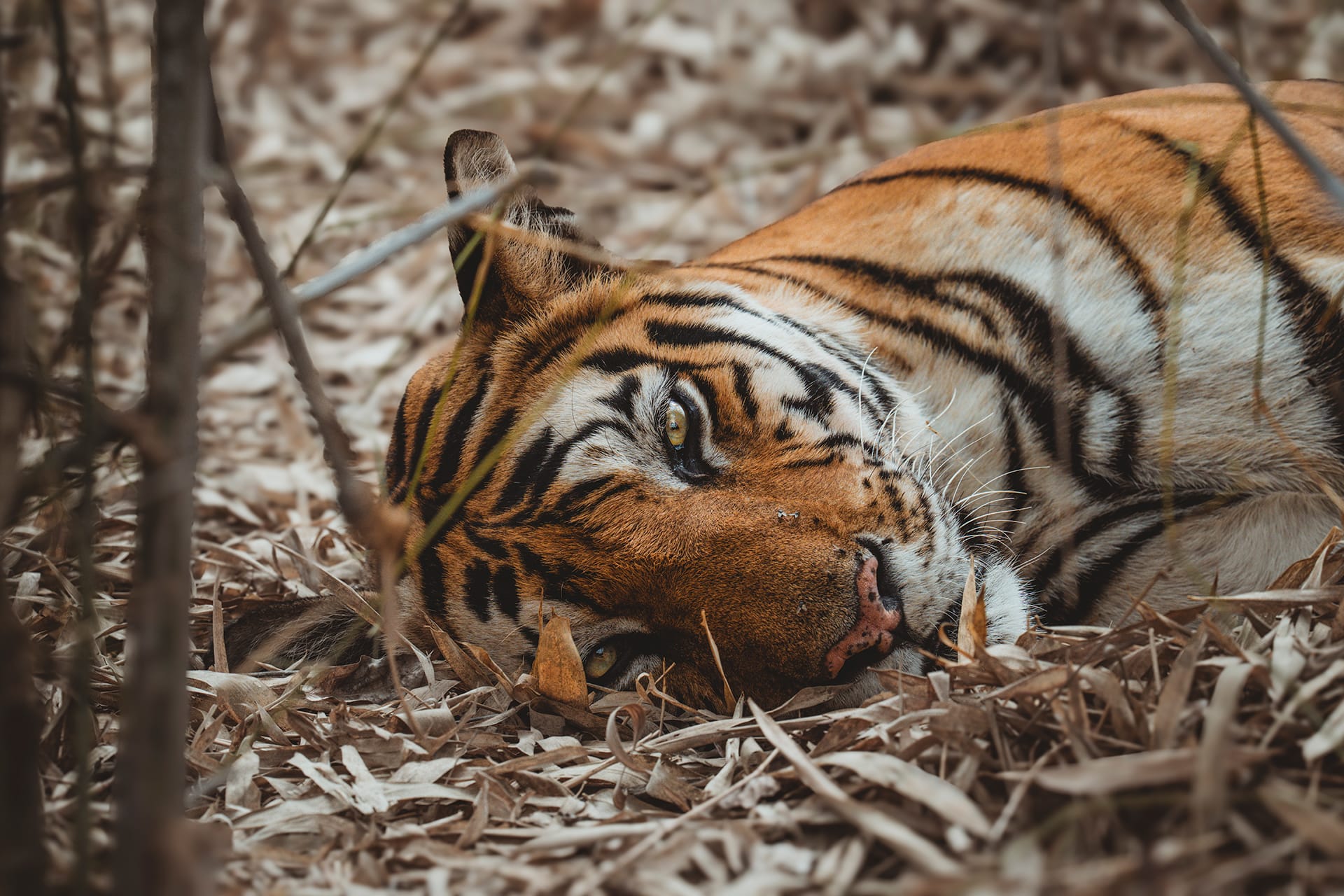 Le voyage se poursuit vers l’Inde centrale et l’atmosphère se transforme. Dans le parc national de Kanha, les paysages s’ouvrent davantage et gagnent en équilibre, baignés d’une lumière douce. Clairières, prairies dorées et forêts composent ce décor avec une visibilité exceptionnelle. C’est dans ce parc qu’est né le Project Tiger, pilier de la conservation du tigre en Inde. Cette réussite se traduit par des comportements plus sereins. Les tigres se montrent confiants, marchent longuement sur les pistes et offrent des scènes prolongées et silencieuses. Autour d’eux, la faune évolue sereinement, avec les barasinghas rassemblés dans les herbes hautes, un bison indien ou encore un ours lippu à l’orée des forêts.